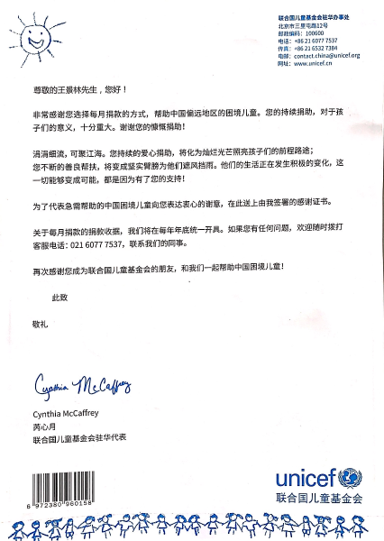 在信的最后,聯(lián)合國(guó)兒童基金會(huì)駐華代表再次代表急需幫助的中國(guó)困境兒童向該同志表達(dá)了衷心的謝意。