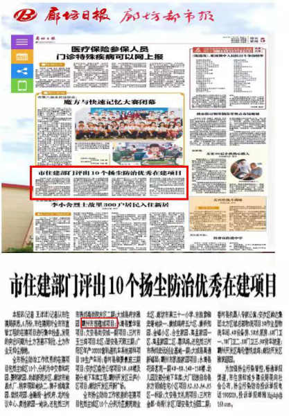 7月7日,從廊坊市住建局獲悉,中國二冶城建分公司河北霸州市國蘊城項目榮獲廊坊市揚塵防治優(yōu)秀在建項目。《廊坊日報——綜合新聞》以題為《市住建部門評出10個揚塵防治優(yōu)秀在建項目》進行跟蹤報道,并進行公布。