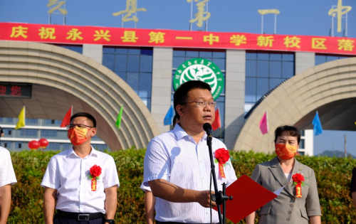 揭牌儀式首先由永興一中校長胡兆文致辭。他指出,永興一中項目建設是造福當?shù)匕傩盏囊豁椫卮竺裆こ?,是功在當代,利在千秋的一件大事。他希望學生們心懷天下做有家國情懷的人,意志堅韌做積極進取的人,心胸開闊做陽光大度的人,心存善意做助人為樂的人。最后,他祝學生們在新的學校快樂成長。