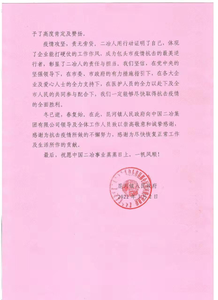 3月2日,昆河鎮(zhèn)人民政府向中國二冶發(fā)來感謝信,對(duì)中國二冶在全市全力阻擊新冠肺炎疫情擴(kuò)散蔓延的緊要關(guān)頭,不畏風(fēng)險(xiǎn),無懼寒冷,守望相助,齊心協(xié)力,以最快速度為昆河鎮(zhèn)快速阻斷社區(qū)傳播鏈和疫情輸出風(fēng)險(xiǎn)所做出的貢獻(xiàn),對(duì)央企快速反應(yīng)、雷厲風(fēng)行的工作作風(fēng)表示感謝。