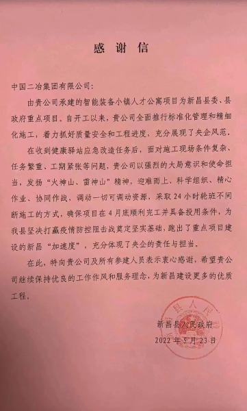 5月24日,中國二冶收到新昌縣人民政府感謝信。信中高度贊揚(yáng)了中國二冶在新昌智能裝備小鎮(zhèn)人才公寓項目建設(shè)中,全面推行標(biāo)準(zhǔn)化管理和精細(xì)化施工,全力抓好質(zhì)量安全和工程進(jìn)度,晝夜不停,勇挑重?fù)?dān),充分展現(xiàn)央企擔(dān)當(dāng)。