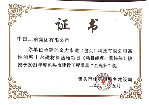 6月1日,中國二冶收到包頭市建筑業(yè)協(xié)會(huì)頒發(fā)的榮譽(yù)證書,中國二冶金力永磁 (包頭)科技有限公司高性能稀土永磁材料基地、包頭市監(jiān)委留置場(chǎng)所、校園南路小區(qū)四期B地塊工程(二標(biāo)段)3#、5#住宅樓三項(xiàng)工程喜獲2021年度包頭市“金鹿杯”工程質(zhì)量獎(jiǎng)。