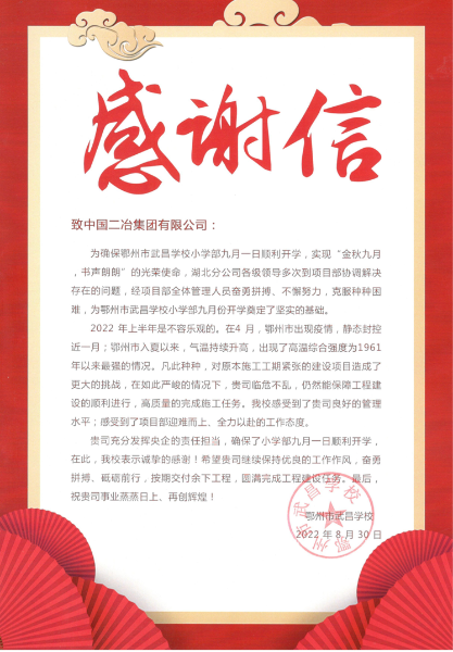感謝信不僅是對中國二冶湖北分公司鄂州市武昌學(xué)校項(xiàng)目的高度認(rèn)可,也是對項(xiàng)目部全體人員日夜兼程、風(fēng)雨無阻艱苦工作的鼓勵與肯定。湖北分公司在接下來的工程建設(shè)任務(wù)中,將繼續(xù)以“高要求、高標(biāo)準(zhǔn)、高水平”的施工理念,強(qiáng)化安全質(zhì)量管理、發(fā)揮團(tuán)隊(duì)凝聚力,以更高昂的精神狀態(tài),更踏實(shí)的優(yōu)良作風(fēng),萬眾一心,艱苦奮斗,繼續(xù)打造優(yōu)質(zhì)工程,展現(xiàn)央企實(shí)力擔(dān)當(dāng)。