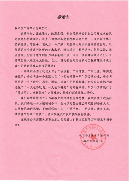 9月26日,包頭中車電機(jī)有限公司向中國二冶致表揚(yáng)信,表揚(yáng)中國二冶戰(zhàn)疫情、冒酷暑、頂風(fēng)沙、斗嚴(yán)寒,克服重重苦難,保證項(xiàng)目建設(shè)順利進(jìn)行的央企作為,對(duì)中國二冶承建的包頭中車項(xiàng)目順利完成各項(xiàng)工程節(jié)點(diǎn)和任務(wù)目標(biāo)表示認(rèn)可。