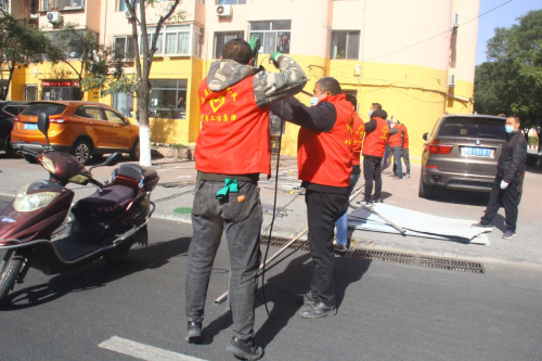 10月8日適逢二十四節(jié)氣中的“寒露”,包頭地區(qū)氣溫驟降十幾度,分公司機關、項目部黨員迎著刺骨的寒風,冒著風險,發(fā)揮“我不沖誰沖”的帶頭示范作用,迅速組織協(xié)調(diào),搬運防疫封閉用的方鋼、彩鋼板等物資,有的黨員親自動手與職工們團結(jié)配合搭設架子,安裝彩鋼板,加快小區(qū)封堵進度。在黨員們的帶動下,職工們斗志昂揚,干勁十足,現(xiàn)場呈現(xiàn)一派繁忙景象。上午9:00時,友誼小區(qū)北門封閉完成,下午13:00時少先二十三社區(qū)封堵完畢,緊接著少先二十二社區(qū)、友誼十八、友誼十三……等社區(qū)紛紛傳來好消息,當天晚上20:25,隨著最后一個社區(qū)門全面封堵,標志著中國二冶快速完成9個社區(qū)、13個街坊和小區(qū)、451棟住宅樓的進出口封閉封堵任務,一道道宛如長龍的藍色城墻屹立在少先路街道街區(qū)四周,二冶人打贏了一場又一場漂亮的攻堅戰(zhàn)。