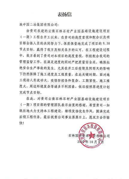 10月8日,中國二冶路橋分公司云南石林石材產(chǎn)業(yè)園項目同時收到來自石林國有資本投資有限公司和石林縣質(zhì)量安全消防監(jiān)督管理站發(fā)來的表揚信,對中國二冶石林項目部管理團隊保質(zhì)保量完成節(jié)點目標及安全任務目標表示高度贊揚。