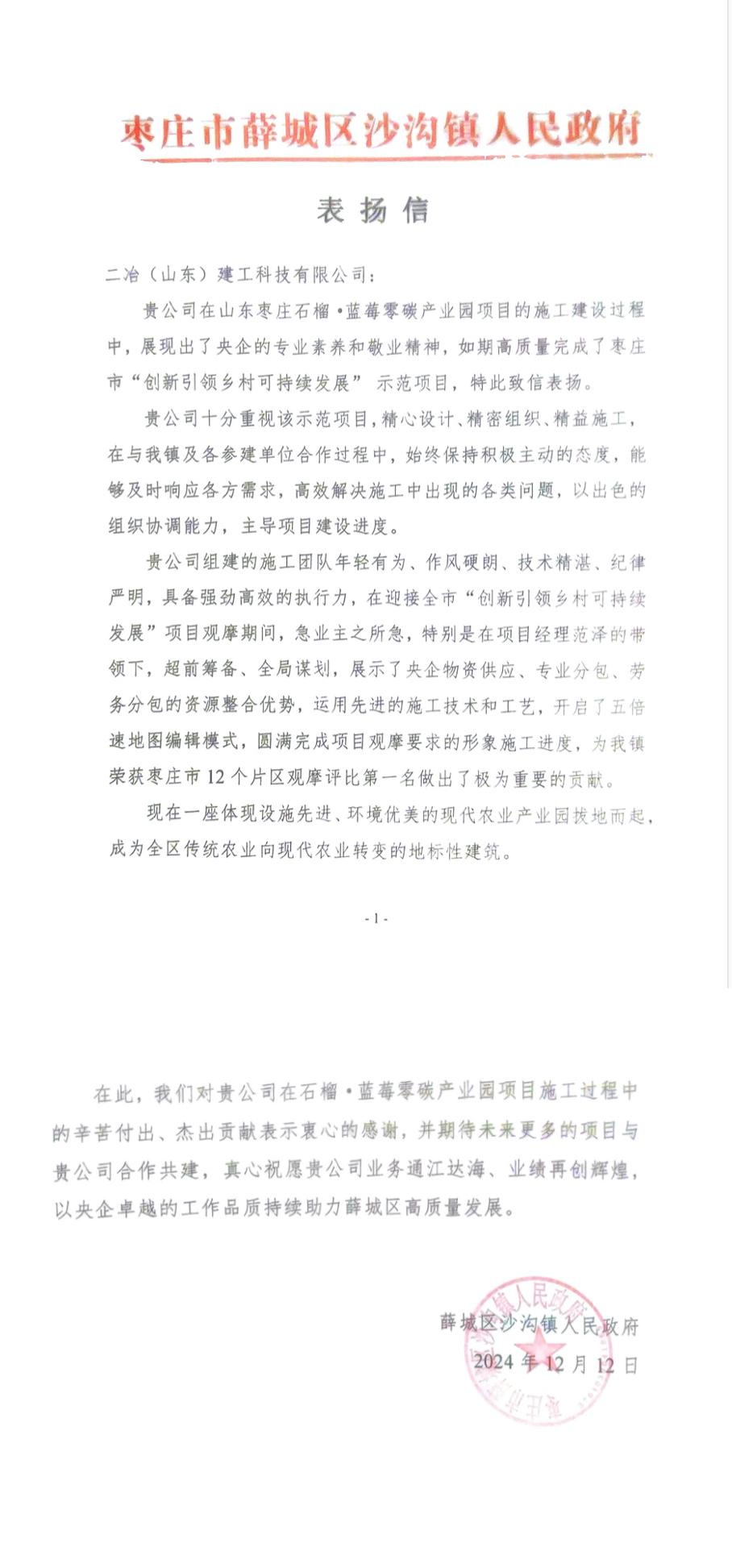 棗莊市薛城區(qū)沙溝鎮(zhèn)人民政府來(lái)信對(duì)二冶(山東)建工在棗莊石榴·藍(lán)莓零碳產(chǎn)業(yè)園項(xiàng)目施工中展現(xiàn)出的央企專業(yè)素養(yǎng)和敬業(yè)精神表示肯定,對(duì)項(xiàng)目在棗莊市12個(gè)片區(qū)觀摩評(píng)比中助力沙溝鎮(zhèn)榮獲第一名所作出的重要貢獻(xiàn)表示由衷感謝,對(duì)今后的合作共建寄予期望。棗莊石榴·藍(lán)莓零碳產(chǎn)業(yè)園項(xiàng)目作為推行國(guó)家鄉(xiāng)村振興戰(zhàn)略、國(guó)家數(shù)字化農(nóng)業(yè)戰(zhàn)略、綠色農(nóng)業(yè)、“雙碳” 戰(zhàn)略的示范項(xiàng)目,受到當(dāng)?shù)卣母叨戎匾暋m?xiàng)目團(tuán)隊(duì)秉承中國(guó)二冶雷厲風(fēng)行、使命必達(dá)的工作作風(fēng),以強(qiáng)勁硬朗的執(zhí)行能力高質(zhì)高效推進(jìn)項(xiàng)目建設(shè)進(jìn)度,為地方鄉(xiāng)村振興奉獻(xiàn)了央企智慧和力量。