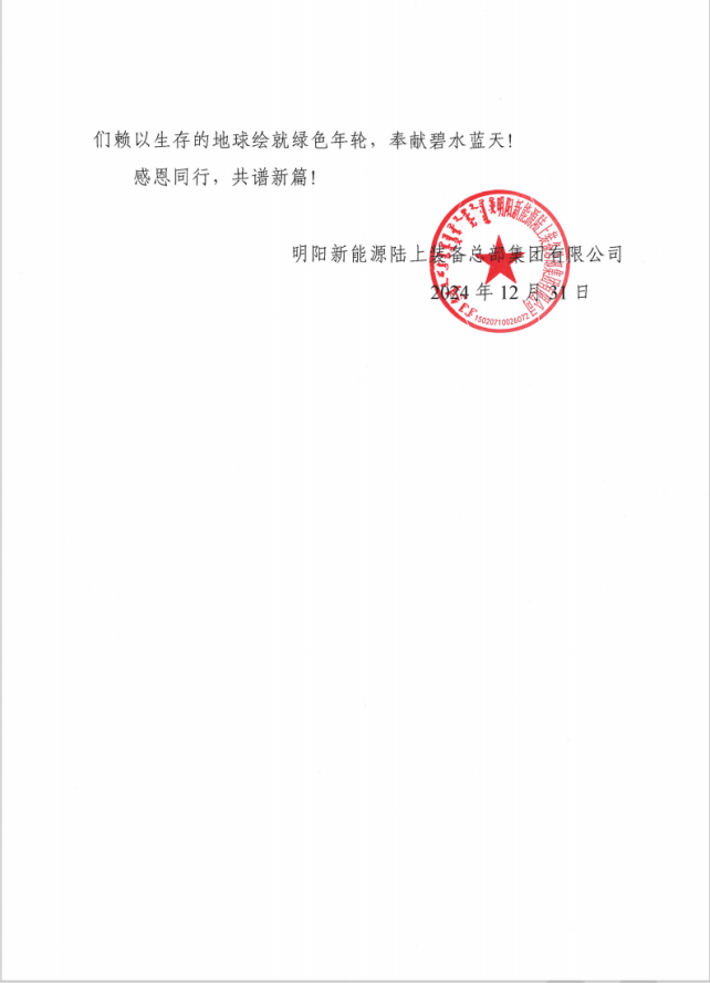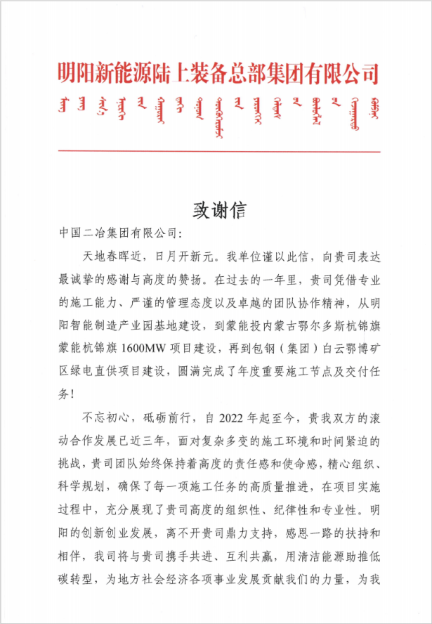 明陽(yáng)智慧能源集團(tuán)股份公司在感謝信中指出,2024年,貴司憑借專業(yè)的施工能力、嚴(yán)謹(jǐn)?shù)墓芾響B(tài)度以及卓越的團(tuán)隊(duì)協(xié)作精神,從明陽(yáng)智能制造產(chǎn)業(yè)園基地建設(shè),到蒙能投內(nèi)蒙古鄂爾多斯杭錦旗蒙能杭錦旗1600兆瓦項(xiàng)目建設(shè),再到包鋼(集團(tuán))白云鄂博礦區(qū)綠電直供項(xiàng)目建設(shè),圓滿完成了年度重要施工節(jié)點(diǎn)及交付任務(wù)。