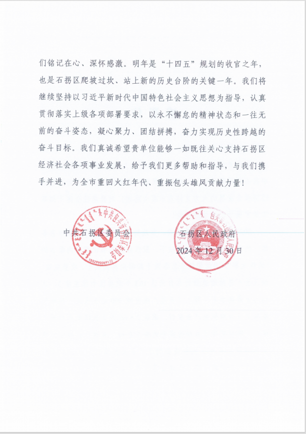 信中指出,2024年,石拐區(qū)在市委、市政府的正確領(lǐng)導(dǎo)下,在市直各部門的鼎力支持和悉心幫扶下,聚焦辦好習(xí)近平總書記交給內(nèi)蒙古的“兩件大事”,團(tuán)結(jié)帶領(lǐng)全區(qū)各族干部群眾真抓實干、攻堅克難,地區(qū)生產(chǎn)總值增速預(yù)計在自治區(qū)103個旗縣區(qū)中排在前5,達(dá)到歷史最高水平;規(guī)上工業(yè)總產(chǎn)值突破300億元大關(guān);風(fēng)電裝備制造成為旗幟性產(chǎn)業(yè)集群;蒙能2×66萬千瓦煤電項目開工建設(shè)。順利實現(xiàn)了系統(tǒng)性提升的奮斗目標(biāo)。在這個過程中,中國二冶在內(nèi)蒙古石拐區(qū)風(fēng)電裝備制造產(chǎn)業(yè)園標(biāo)準(zhǔn)化廠房項目及科創(chuàng)園區(qū)生態(tài)護(hù)坡一期項目等工程建設(shè)中給予大力支持,我們銘記在心、深懷感激。明年是“十四五”規(guī)劃的收官之年,也是石拐區(qū)爬坡過坎、站上新的歷史臺階的關(guān)鍵一年。我們將繼續(xù)堅持以習(xí)近平新時代中國特色社會主義思想為指導(dǎo),認(rèn)真貫徹落實上級各項部署要求,以永不懈怠的精神狀態(tài)和一往無前的奮斗姿態(tài),凝心聚力、團(tuán)結(jié)拼搏,奮力實現(xiàn)歷史性跨越的奮斗目標(biāo)。